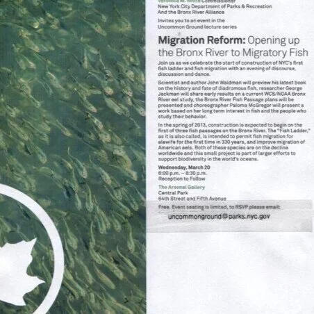Scientist and author John Waldman will preview his latest book on the history and fate of diadromous fish, researcher George Jackman will share early results on a current WCS/NOAA Bronx River eel study, the Bronx River Fish Passage plans will be presented and choreographer Paloma McGregor will present a work based on her long term interest in fish and the people who study their behavior.
